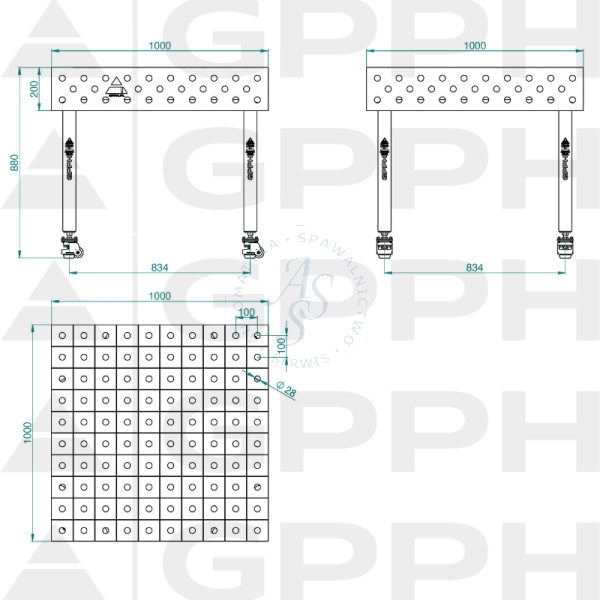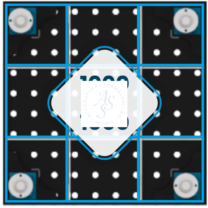 Blaty stołów GPPH ECO mają grubość 8mm, posiadają gęste ożebrowanie, co wpływa na idealnie płaską powierzchnię roboczą. Stół o wymiarze 1000×1000 mm ma 2 żebra wzdłużne i 2 żebra podłużne. Masywna i sztywna podbudowa blatu stołu gwarantuje najwyższą stabilność podczas użytkowania oraz zabezpieczenie przed odkształceniem. Tolerancja płaskości stołu na całym blacie wynosi ±0,5 mm, a tolerancja wykonania otworów stołu spawalniczego wynosi ±0,1 mm.