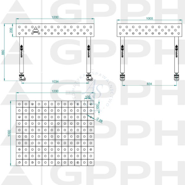 Blaty stołów GPPH ECO mają grubość 8mm, posiadają gęste ożebrowanie, co wpływa na idealnie płaską powierzchnię roboczą. Stół o wymiarze 1200×1000 mm ma 2 żebra wzdłużne i 2 żebra podłużne. Masywna i sztywna podbudowa blatu stołu gwarantuje najwyższą stabilność podczas użytkowania oraz zabezpieczenie przed odkształceniem. Tolerancja płaskości stołu na całym blacie wynosi ±0,5 mm, a tolerancja wykonania otworów stołu spawalniczego wynosi ±0,1 mm.