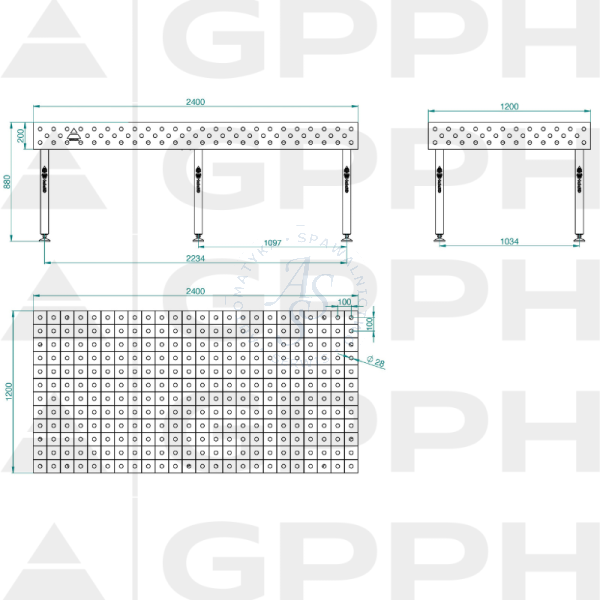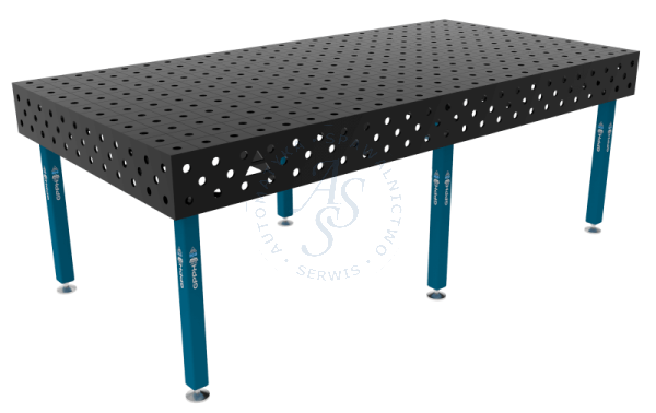 Blaty stołów GPPH ECO mają grubość 8mm, posiadają gęste ożebrowanie, co wpływa na idealnie płaską powierzchnię roboczą. Stół o wymiarze 2400×1200 mm ma 2 żebra wzdłużne i 5 żebra podłużne. Masywna i sztywna podbudowa blatu stołu gwarantuje najwyższą stabilność podczas użytkowania oraz zabezpieczenie przed odkształceniem. Tolerancja płaskości stołu na całym blacie wynosi ±0,5 mm, a tolerancja wykonania otworów stołu spawalniczego wynosi ±0,1 mm.