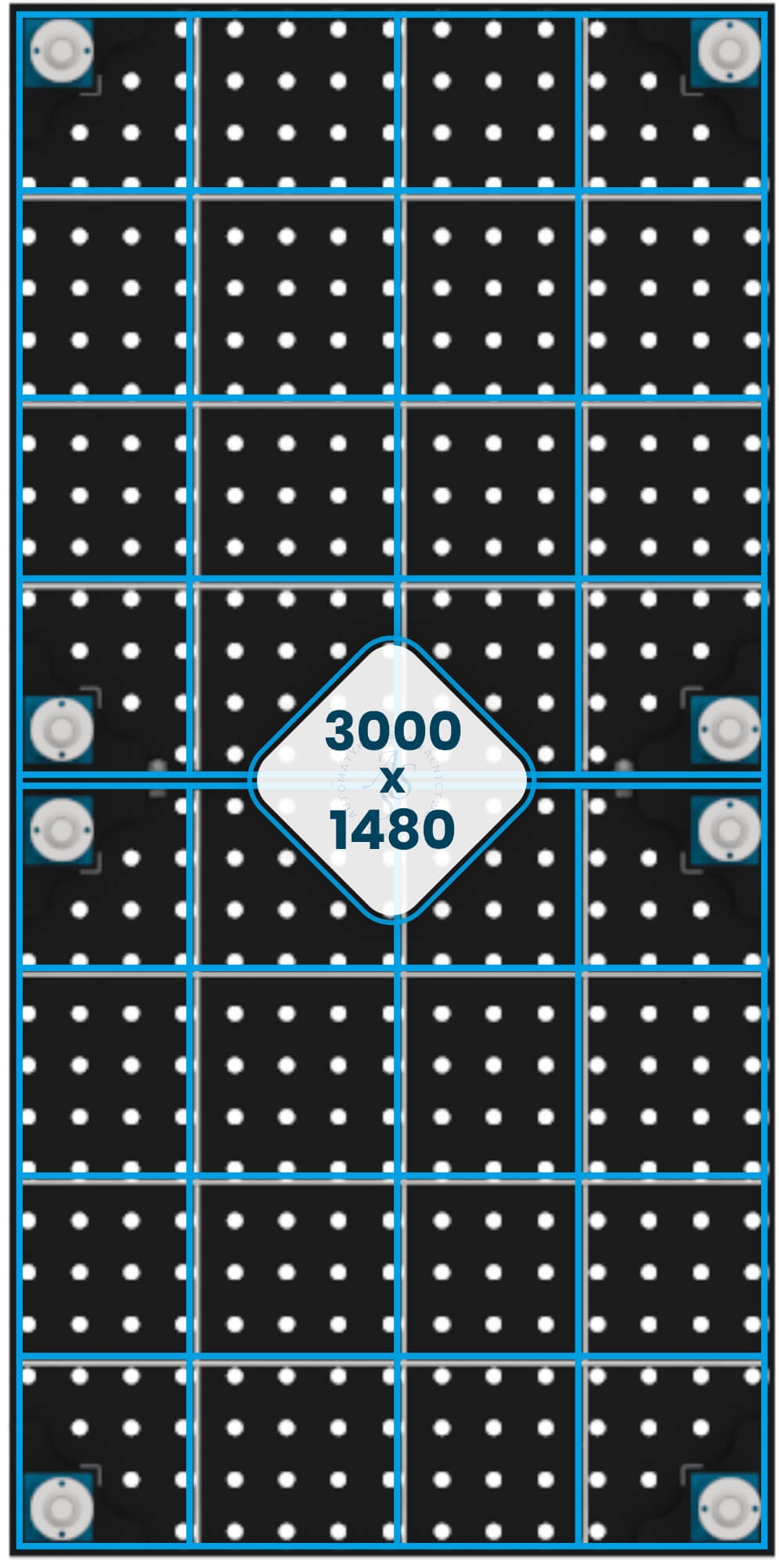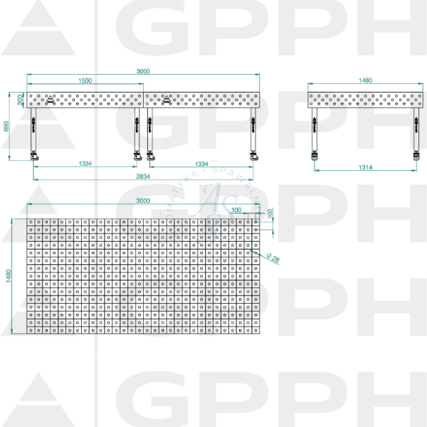 Blaty stołów GPPH ECO mają grubość 8mm, posiadają gęste ożebrowanie, co wpływa na idealnie płaską powierzchnię roboczą. Stół o wymiarze 3000×1480 mm ma 3 żebra wzdłużne i 6 żebra podłużne. Masywna i sztywna podbudowa blatu stołu gwarantuje najwyższą stabilność podczas użytkowania oraz zabezpieczenie przed odkształceniem. Tolerancja płaskości stołu na całym blacie wynosi ±0,5 mm, a tolerancja wykonania otworów stołu spawalniczego wynosi ±0,1 mm. Stół spawalniczy GPPH o wymiarze 3000×1480 składa się z dwóch połączonych ze sobą stołów spawalniczych o wymiarze 1500×1480.
